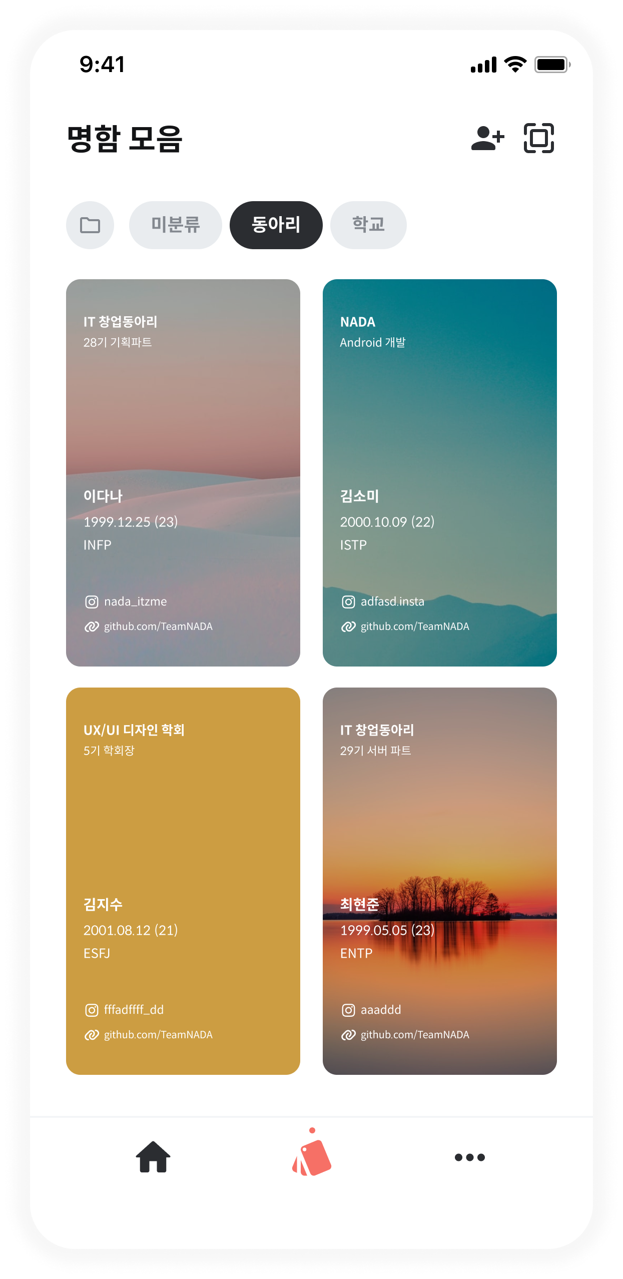 이제는 나다로 명함을 교환하며 쉽고 재미있게 서로를 알아가 보세요.