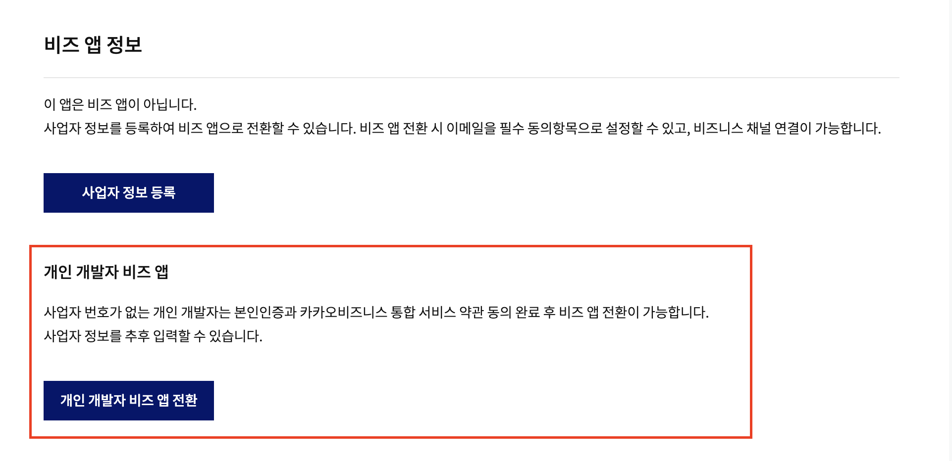 사업자 번호가 없는 경우 비즈 앱 설정하는 방법이 변경되었습니다. 개인 개발자 비즈 앱 전환 방법 가이드 : 애플리케이션 | Kakao Developers 애플리케이션 사업자등록번호가 없는 개인이나 단체가