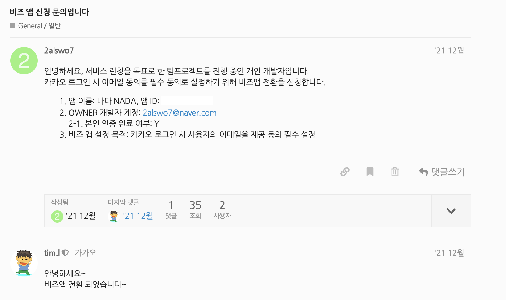 생각보다 그 방법은 간단한데, 전환을 신청할 앱 소유자(Owner) 계정이 본인인증을 받은 상태에서 개발자 포럼인 데브톡에 글쓰기를 통해 비즈 앱 전환을 요청하면 된다.