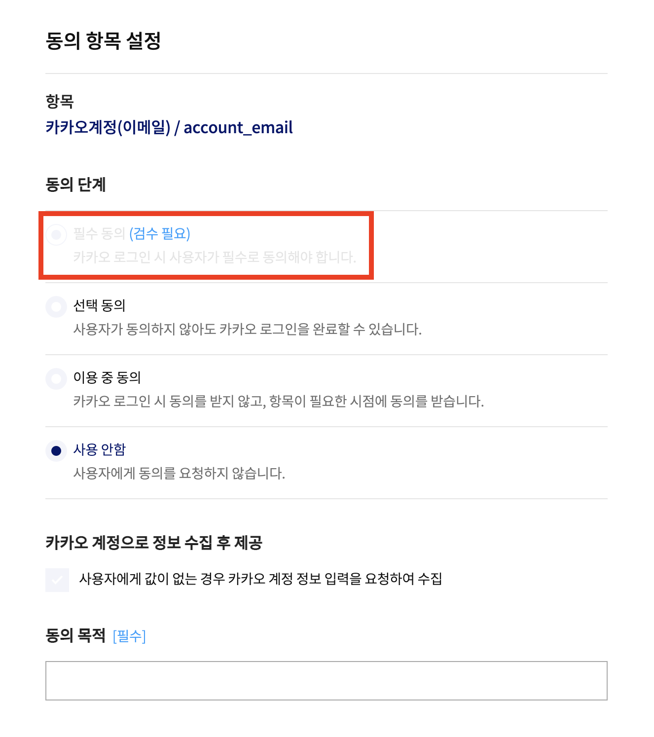 하지만, 처음 동의 항목을 수정할 때는 아래에서 보이는 것과 같이 카카오계정 이메일은 사용자에게 필수 동의 항목으로 값을 받는 것이 불가능했다.