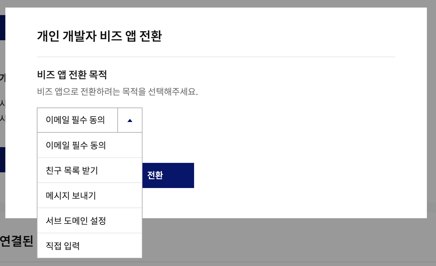 이 문제를 해결하기 위해서는 카카오 개발자 계정에 등록한 애플리케이션을 비즈 앱으로 전환시켜야 했다.