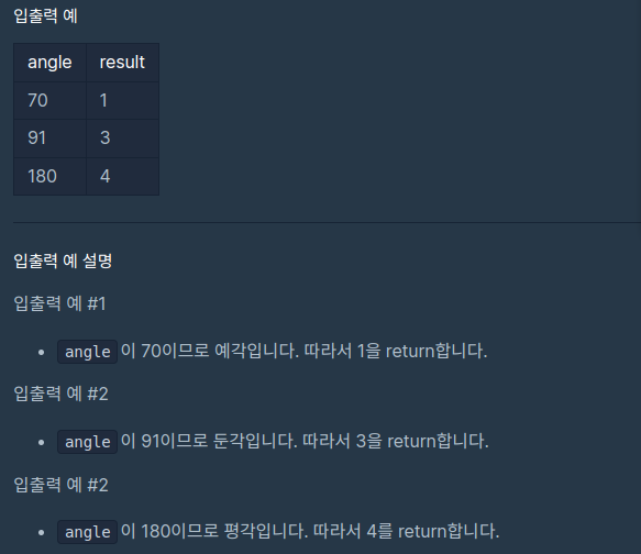 각 angle이 매개변수로 주어질 때, 각각 예각은 1, 직각은 2, 둔각은 3, 평각은 4로 반환하라는 문제이다.