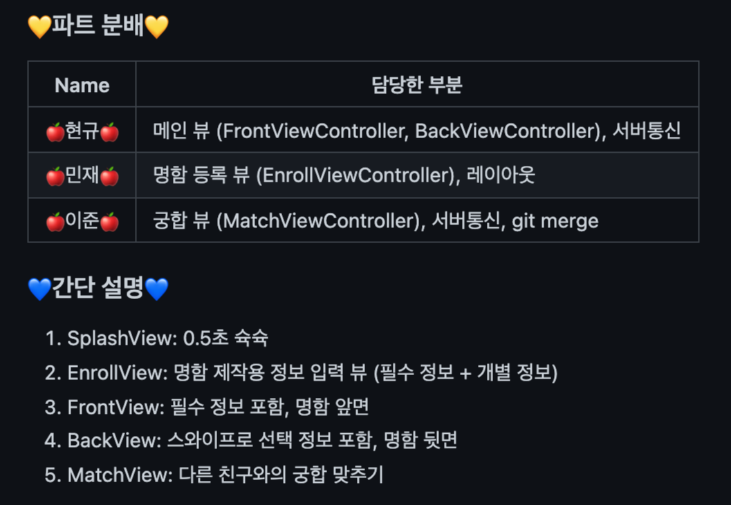 깃허브 내 리드미에 파트 분배 내역과, 서비스 간단 설명, 부족하지만 Commit Convention까지 정해서 3명의 개발자가 함께 협업을 진행했다.