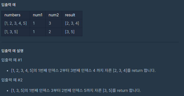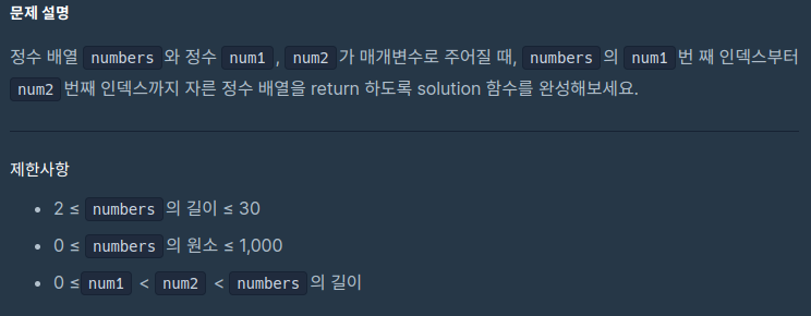 주어진 배열의 num1 인덱스부터 num2 인덱스까지 자른 배열을 반환하라는 문제이다.