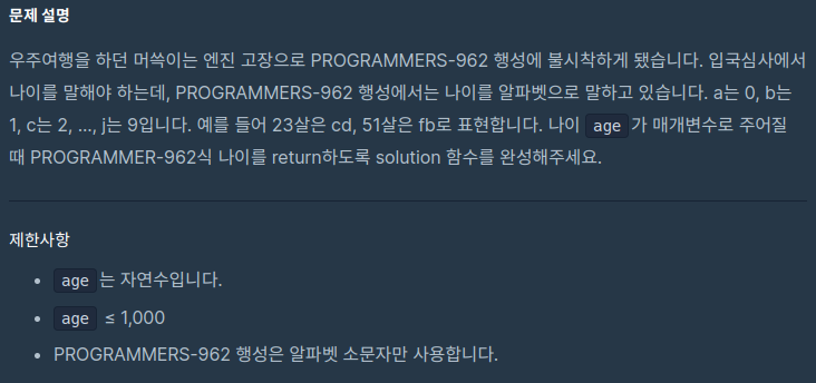 0부터 9까지의 숫자를 알파벳(a~j) 순으로 정해진 문자로 조합한 문자열을 반환하라는 문제다.