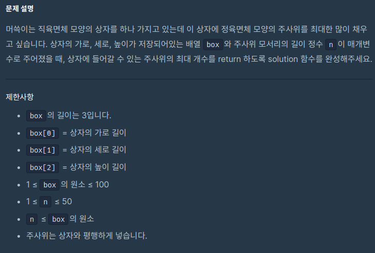 직육면체 box 안에 정육면체 주사위를 최대한 많이 채울 수 있는 개수를 반환하라는 문제이다.