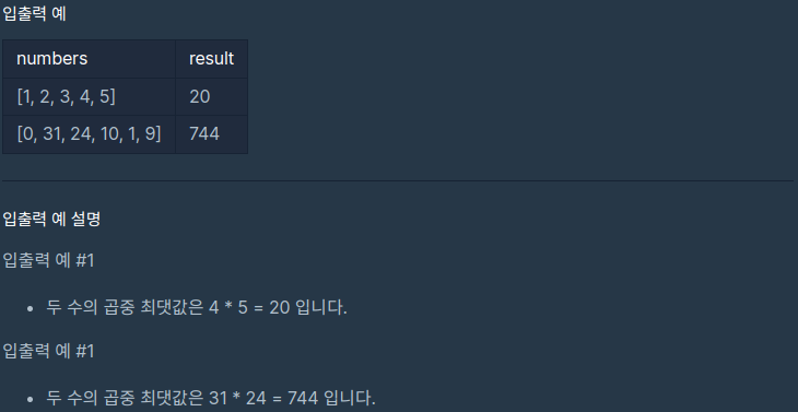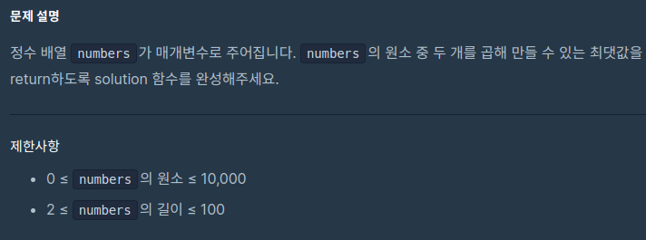 정수 배열이 주어질 때, 배열 안에 있는 원소 중 두 개를 곱해 만들 수 있는 최댓값을 반환하라는 문제이다.