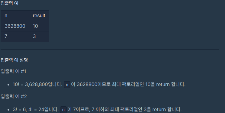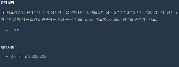 정수가 주어질 때, i! <= n 조건을 만족하는 가장 큰 정수 i를 반환하라는 문제이다.