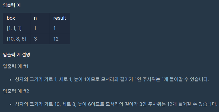 가로, 세로, 높이가 순서대로 주어지는 배열 box와 정육면체 주사위의 모서리 길이 n이 매개변수로 주어졌을 때,