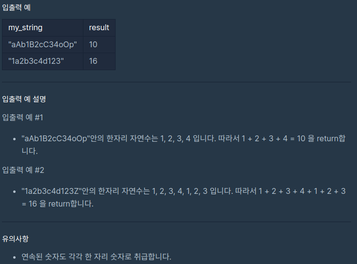 문자열이 주어질 때, 문자열 안에 있는 모든 자연수의 합을 구하라는 문제이다.