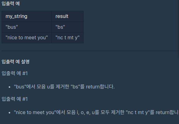 문자열이 주어질 때, 모음 (a, e, i, o, u)를 제거한 문자열을 반환하라는 문제이다.