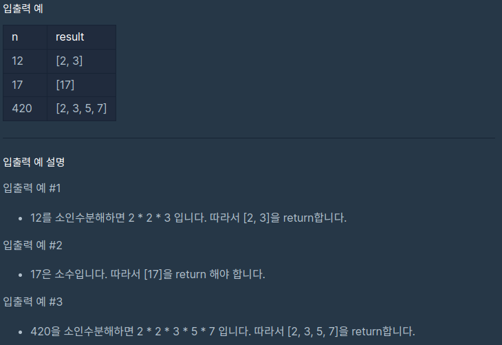 주어진 자연수의 소인수를 오름차순으로 담은 배열을 구하라는 문제이다.