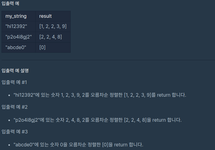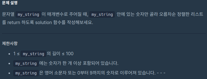 문자열이 주어질 때, 문자열 안에 있는 숫자만 골라, 오름차순으로 정렬한 리스트를 반환하라는 문제이다.