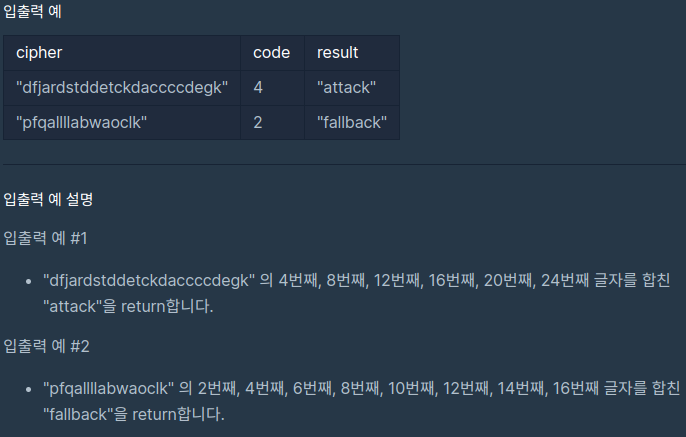 code의 배수번째 글자만 cipher 문자열에서 추출한 문자열을 반환하라는 문제이다.
