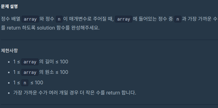 정수 배열과 정수 n이 매개변수로 주어질 때, 정수 배열에 들어있는 수 중에서 n이랑 가장 가까운 수를 반환하라는 문제이다.