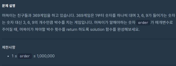 숫자가 주어지면, 369게임 (3, 6, 9의 개수만큼 박수를 치는 게임)과 같이 쳐야 할 박수 횟수를 구하라는 문제이다.