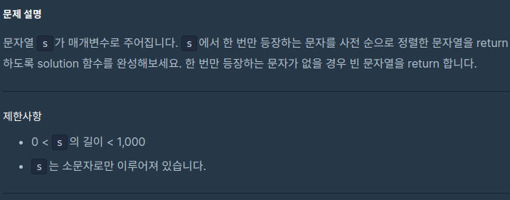 주어진 문자열에서 한 번만 등장하는 문자를 사전 순으로 정렬한 문자열을 반환하라는 문제이다.