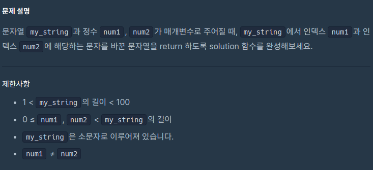 문자열과 정수 num1과 num2가 주어질 때, 문자열의 인덱스 num1에 해당하는 문자와 인덱스 num2에 해당하는 문자를 바꾼 문자열을 반환하라는 문제이다.