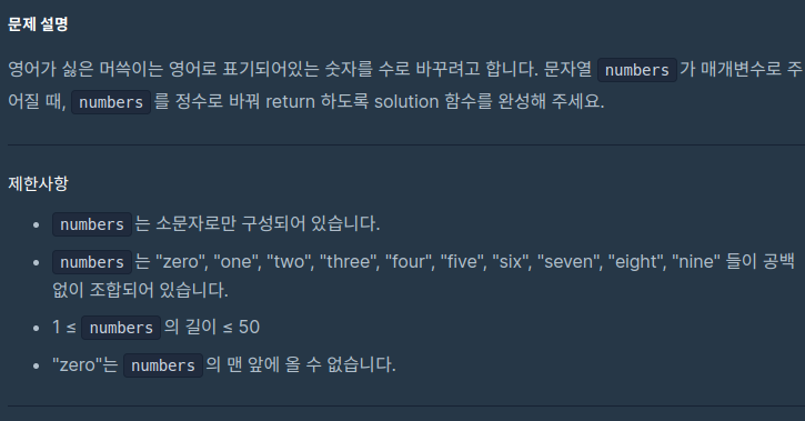 영어로 표시되어 있는 숫자를 수로 바꾸라는 문제이다. (예시: "onefourzerosixseven" -> 14067)