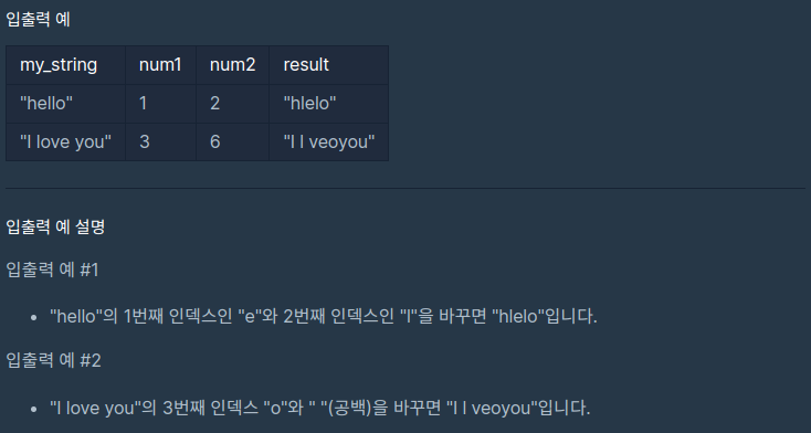 문자열과 정수 num1과 num2가 주어질 때, 문자열의 인덱스 num1에 해당하는 문자와 인덱스 num2에 해당하는 문자를 바꾼 문자열을 반환하라는 문제이다.