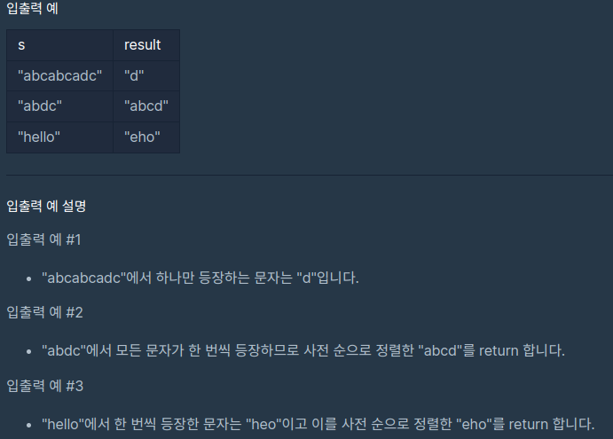 주어진 문자열에서 한 번만 등장하는 문자를 사전 순으로 정렬한 문자열을 반환하라는 문제이다.