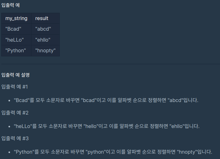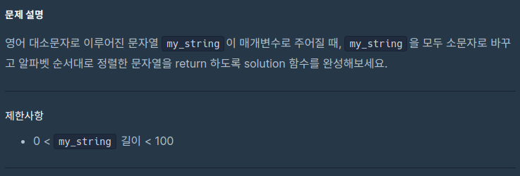 (1) 해당 문자열을 모두 소문자로 바꾸고 (2) 알파벳 순서대로 정렬한 문자열을 반환하라는 문제이다.