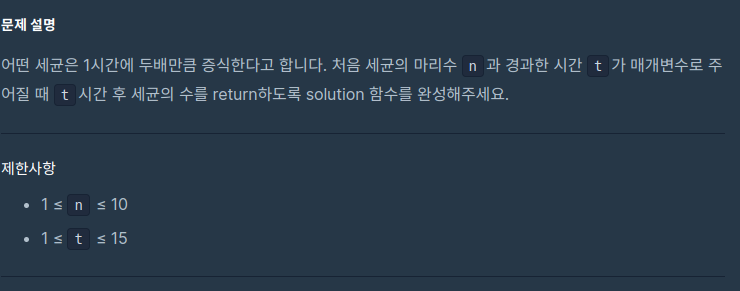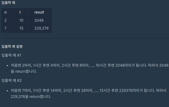 주어진 시간(t)만큼 세균의 수(n)를 2배로 하는 연산의 반복을 계속하면 된다고 생각했다.