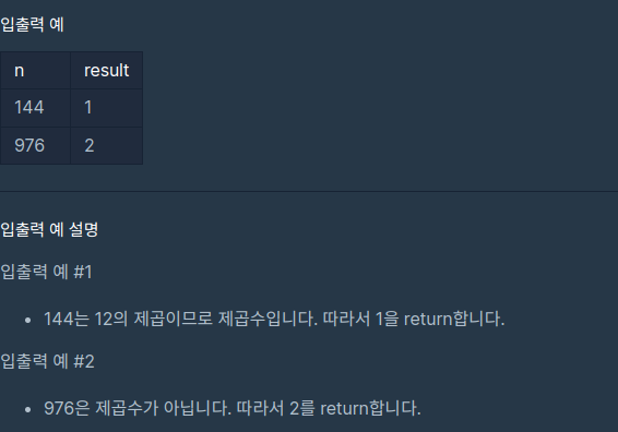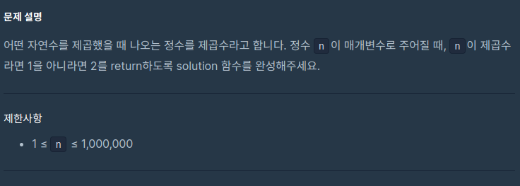 주어진 정수가 제곱수라면 1을, 제곱수가 아니라면 2를 반환하라는 문제이다.