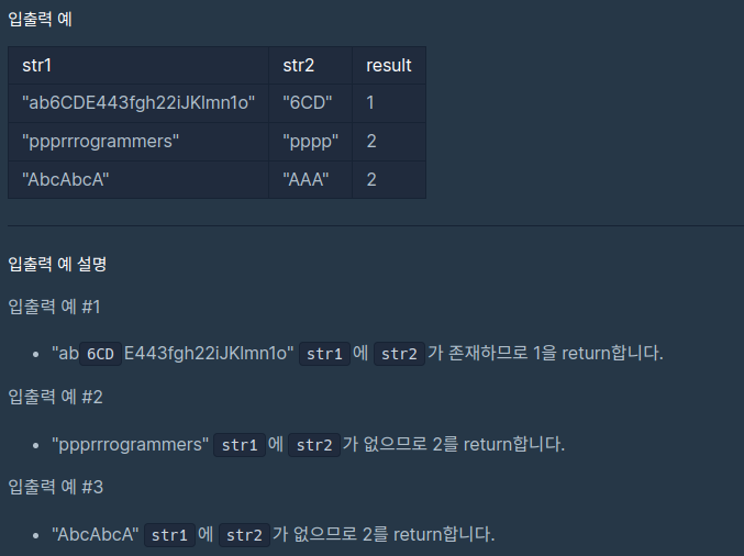 str1 안에 str2가 들어 있다면 1을, str2가 없다면 2를 반환하라는 문제이다.
