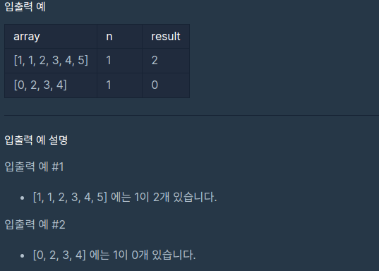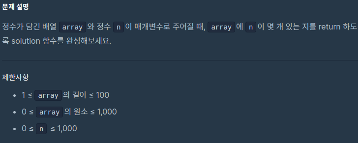 정수가 담긴 배열 안에 n이라는 정수가 몇 개 있는지를 구하라는 문제이다.