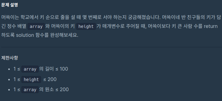 반 친구들의 키가 담겨있는 배열(array)과 어떤 한 친구의 키(height)가 주어질 때, 그 친구보다 키 큰 사람의 수를 구하라는 문제이다.
