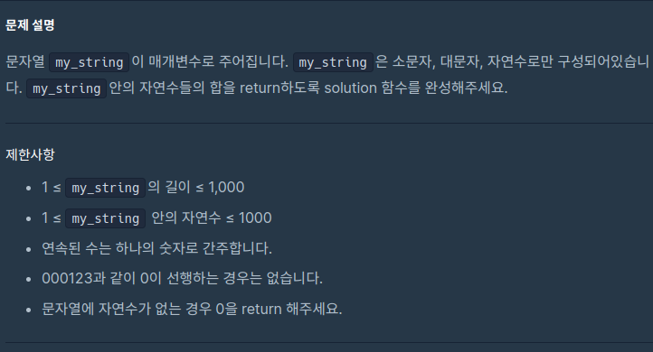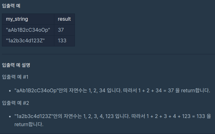 소문자, 대문자, 자연수로만 구성되어 있는 문자열 my_string이 주어질 때, my_string 안에 있는 자연수들의 합을 구하라는 문제이다.