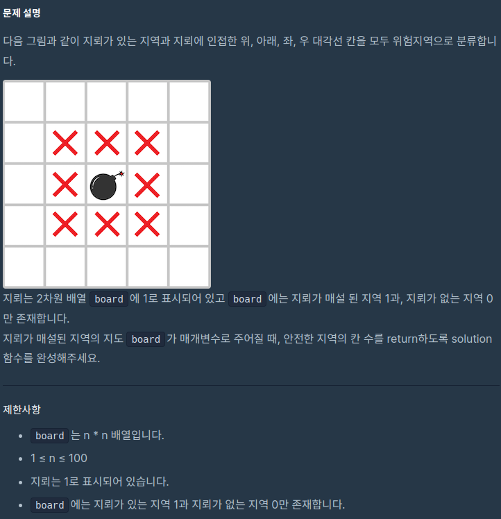 지뢰가 매설된 지역이 나타나있는 board 배열이 주어진다. 이때, 안전한 지역(=위험지역이 아닌 곳)의 칸 수를 구하라는 문제이다.
