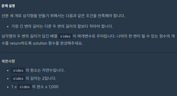 삼각형의 두 변의 길이가 담긴 배열이 주어질 때, 나머지 한 변이 될 수 있는 정수의 개수를 구하라는 문제이다.