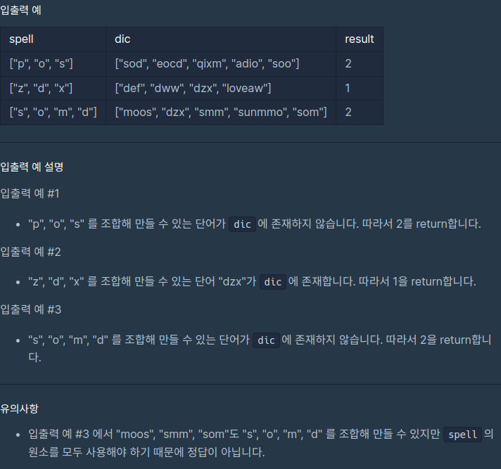 spell에 담긴 알파벳을 한 번씩만 모두 사용한 단어가 dic에 존재하면 1을, 존재하지 않는다면 2를 반환하라는 문제이다.