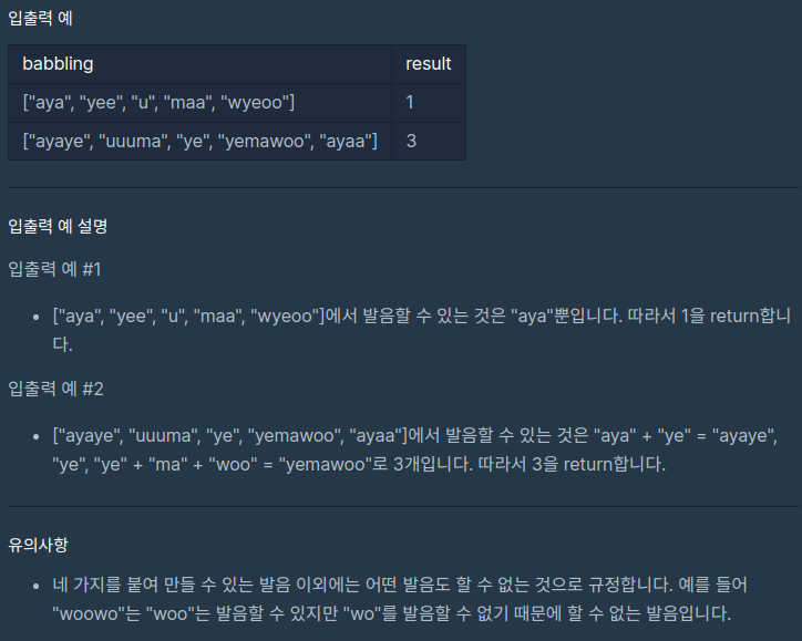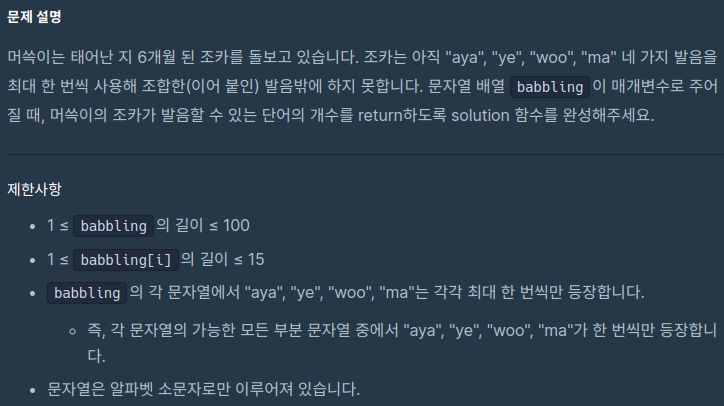 문자열이 담겨있는 babbling 배열이 주어질 때, 배열 안의 문자열 중 아기가 발음할 수 있는 단어의 개수를 구하라는 문제이다.