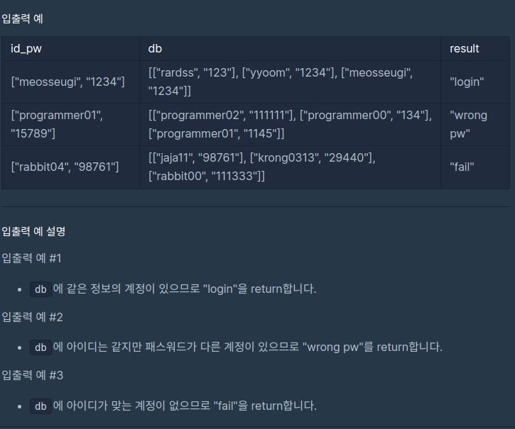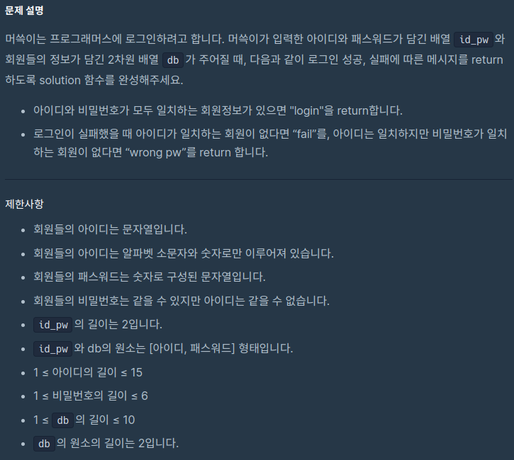 사용자가 입력한 아이디와 패스워드가 담긴 배열 id_pw와 회원들의 정보가 담긴 2차원 배열 db가 주어질 때,