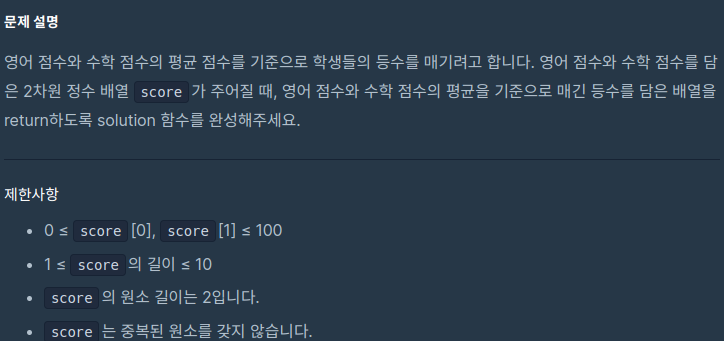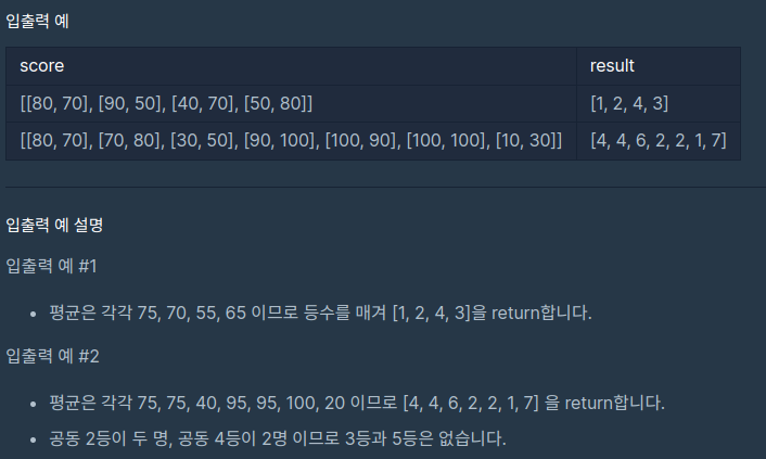 영어 점수와 수학 점수가 순서대로 담겨있는 2차원 정수 배열(score)이 주어질 때, 영어 점수와 수학 점수의 평균을 기준으로 매긴 등수를 담은 배열을 구하라는 문제이다.