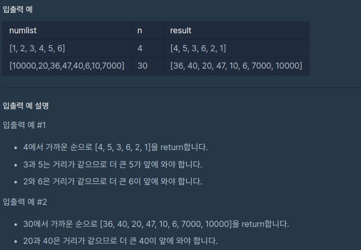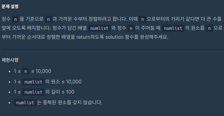 배열 numlist와 정수 n이 주어질 때, numlist의 원소를 n으로부터 가까운 순서대로 정렬한 배열을 구하라는 문제이다.