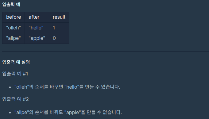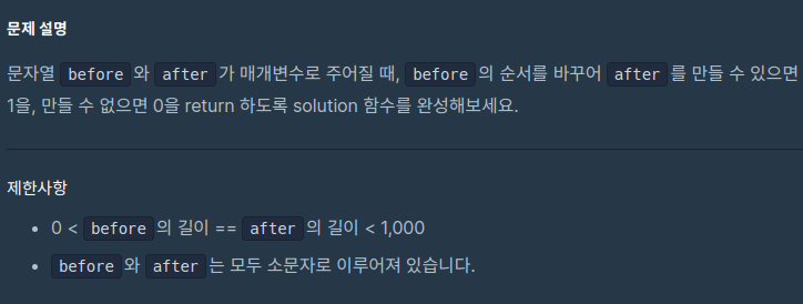 문자열 before의 순서를 바꾸어 문자열 after를 만들 수 있으면 1을, 만들 수 없으면 0을 반환하라는 문제이다.