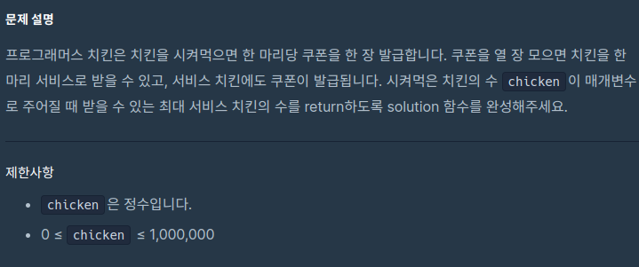 시켜 먹은 치킨의 수가 주어질 때, 받을 수 있는 최대 서비스 치킨의 수를 구하라는 문제이다.