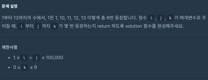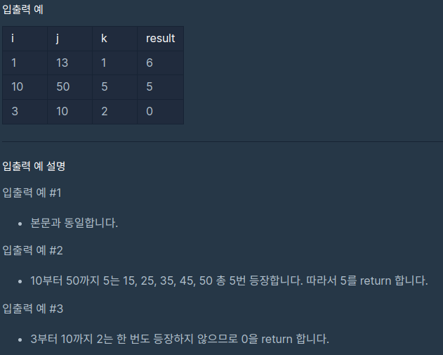정수 i, j, k가 주어질 때, i부터 j까지 k가 몇 번 등장하는지를 구하라는 문제이다.