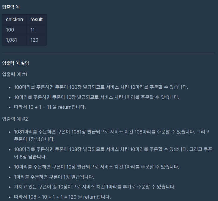 2) chicken에는 10으로 나누고 남은 나머지 값과 + 서비스로 받은 치킨의 값을 저장해 둔다 (서비스로 주는 치킨에도 쿠폰을 발급해 준다고 했음).