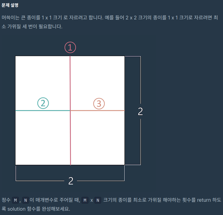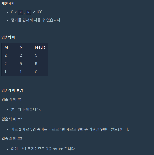 M x N 크기의 큰 종이를 1 x 1 크기로 자르려고 할 때, 최소로 가위질해야 하는 횟수를 구하라는 문제이다.