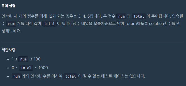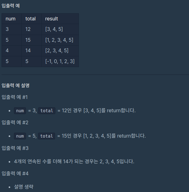 예를 들어 num은 3이고, total은 12일 때 -> 연속된 3개의 정수를 더해 12를 만드는 정수 배열을 오름차순으로 담아 구하라는 뜻!