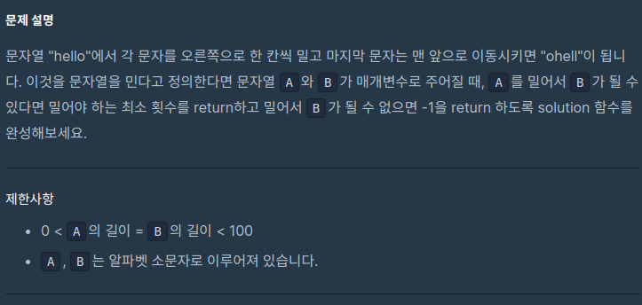 문자열 A와 B가 주어질 때, A를 밀어서 B가 될 수 있다면, 밀어야 하는 최소 횟수를 구하라는 문제이다.