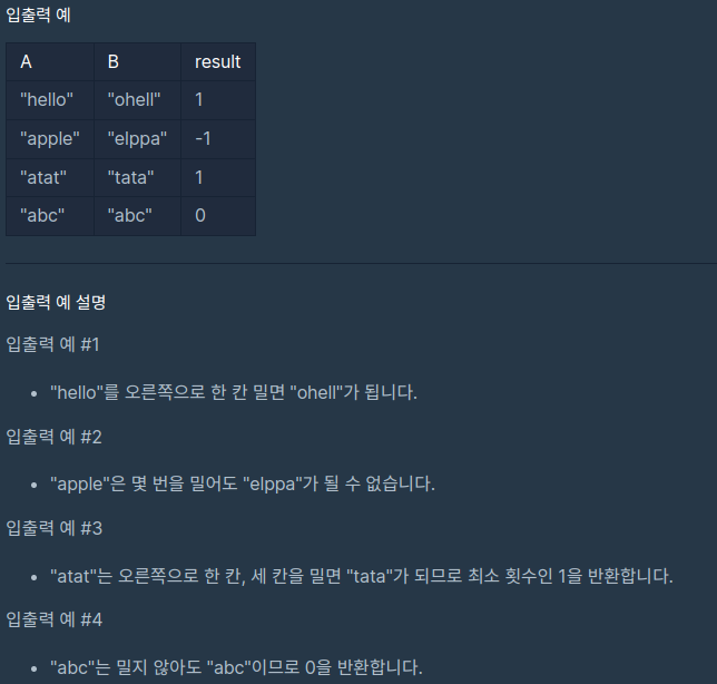 세 번째, A의 길이만큼 밀었는데도 (한바퀴 돈 경우) 같은 값이 나오지 않는 경우 -> -1 반환 (될 수 없다고 판단)
