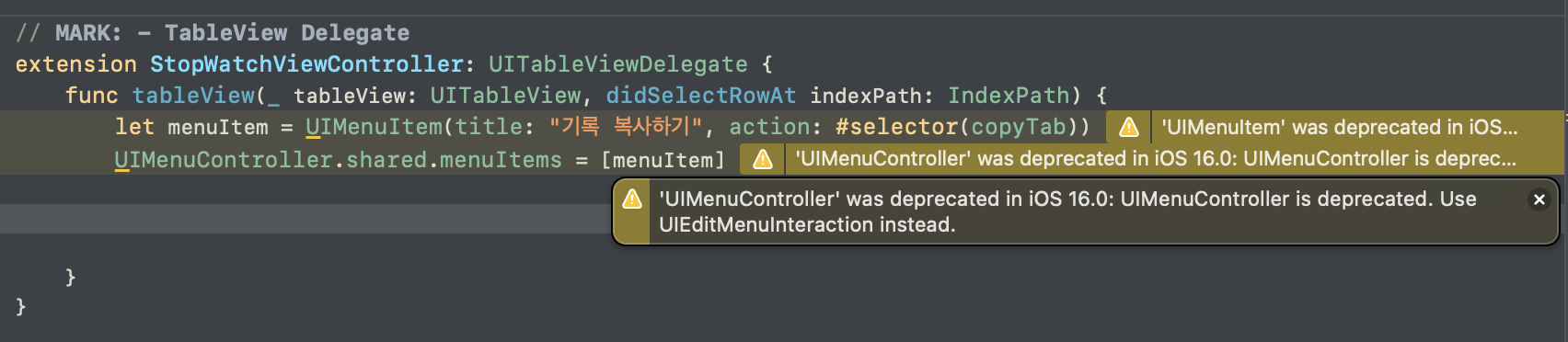 해석하면, "UIMenuController는 iOS 16.0에서 더 이상 사용되지 않습니다."