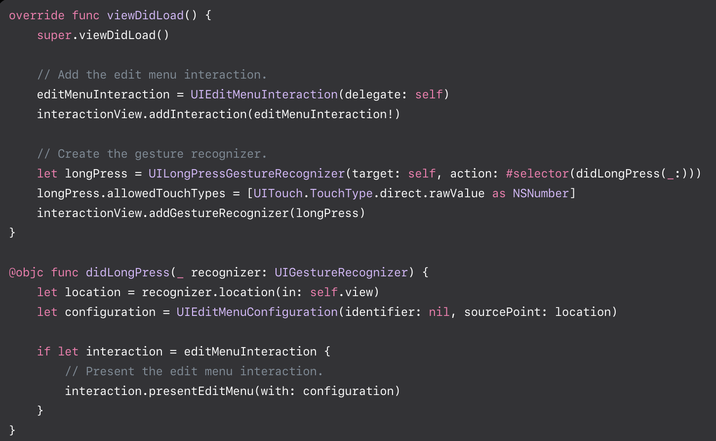 let copyMenuInteraction = UIEditMenuInteraction(delegate: self)