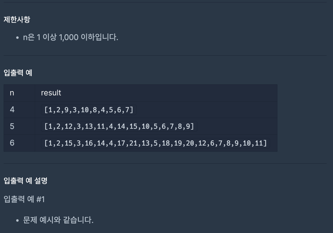 값을 넣을 2차원 배열을 만든다. -> 배열에 들어가는 최댓값을 구한다.(n=4일 때 10, n=5일 때 15) -> 1부터 구한 최댓값까지 반복하면서 올바른 행, 열 위치에 따라 값을 넣어준다. -> 2차원 배열을 1차원 배열로 풀어주고, 반환한다.